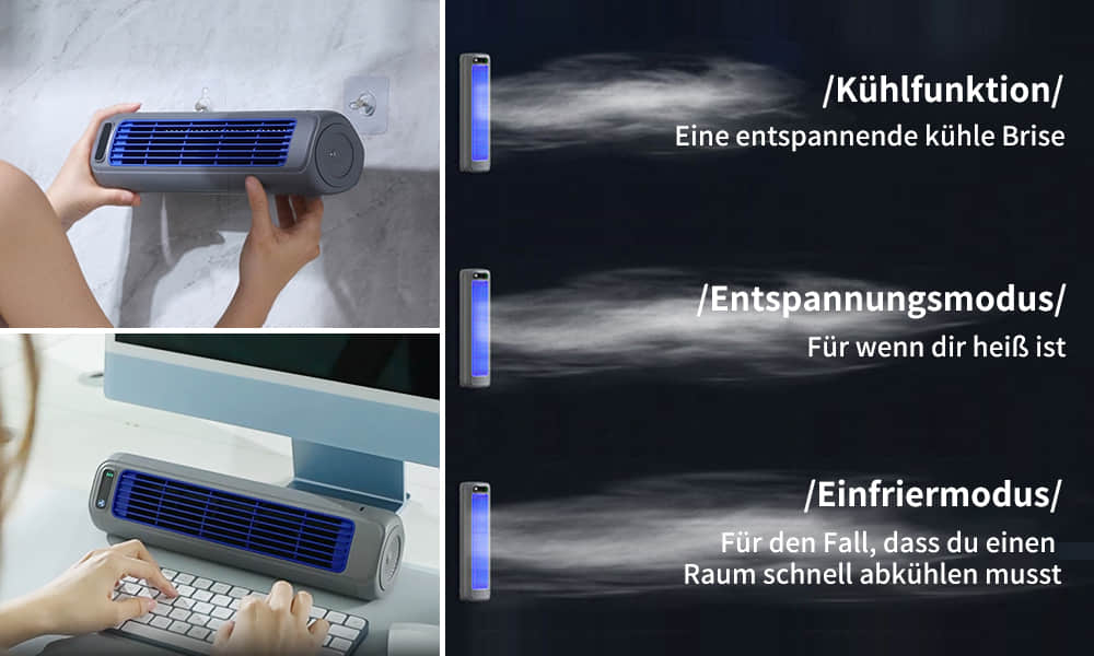 Platzieren Sie es auf Ihrem Schreibtisch (oder montieren Sie es an der Wand) und drücken Sie die Starttaste. Das war's! Sie werden das Gefühl genießen, wie kalte Luft direkt auf Sie bläst.
